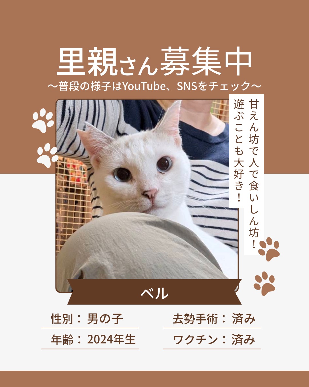 HOME > 保護猫 > ベル 2024生まれ オス 甘えん坊でやんちゃでブルーアイがきれいな子です 2025年12月17日 ベル出演YouTubeのご紹介 ベルちゃんのことが気になった方や、保護猫の里親に興味のある方は、ぜひ譲渡までの流れをご確認下さい。 アベニール譲渡会 ミキズハウス *毎月第1日曜 11-15時 森の里親会ミキズハウス(map) 森の里親会ミキズハウスの譲渡会の様子 浦添大公園 *毎月第2土曜 13-16時 浦添大公園 南エントランス多目的室(map) 浦添大公園の譲渡会の様子 マンガ倉庫泡瀬店 *毎月第4土曜 14-17時 マンガ倉庫泡瀬店(map) マンガ倉庫泡瀬店の譲渡会の様子 一般の方が保護している猫ちゃんの参加も受け付けています。 お問合せは公式LINEよりお願い致します -